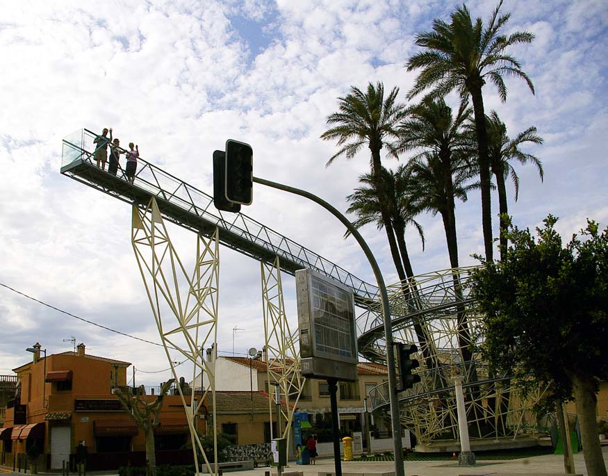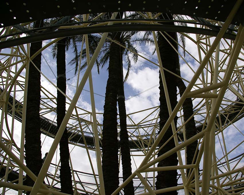 Having a valuable palm tree in danger of collapse, the town decided to make a feature of the scaffolding allowing visitors a unique skywalk round it.